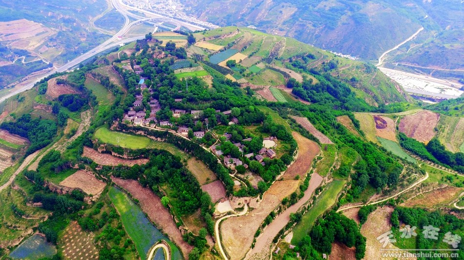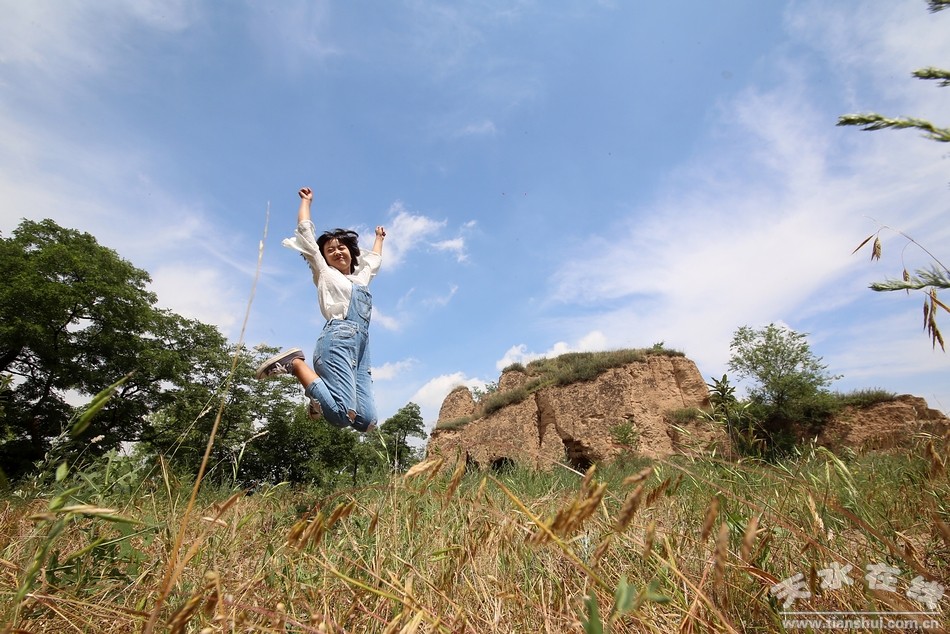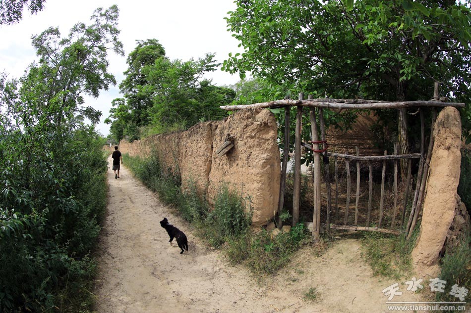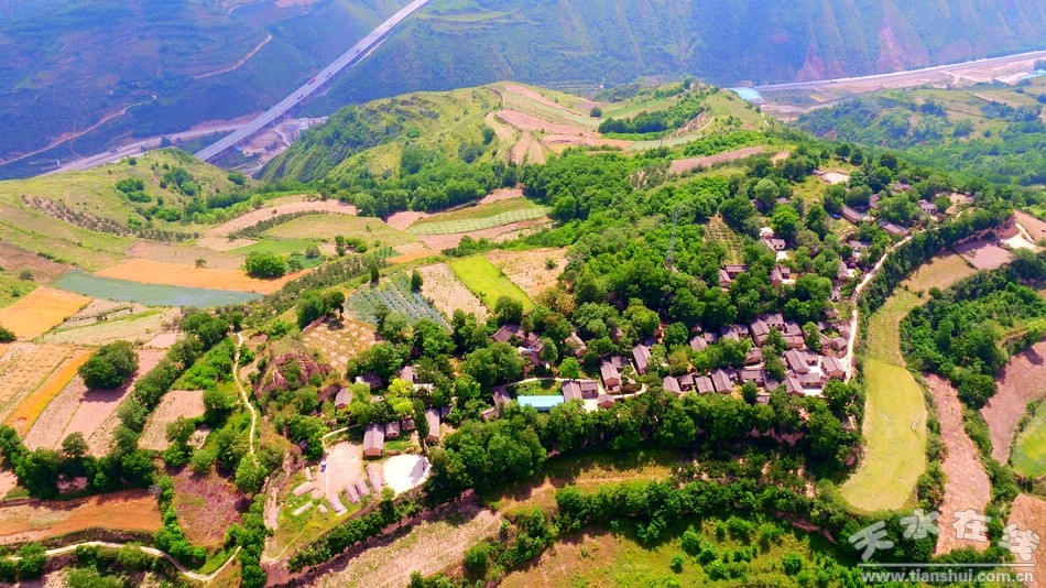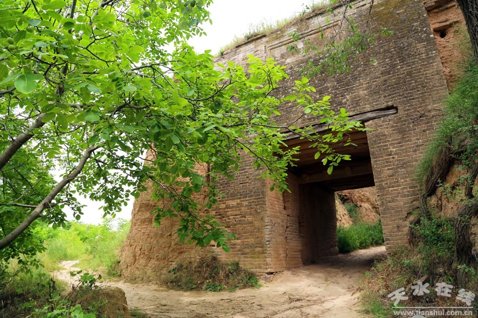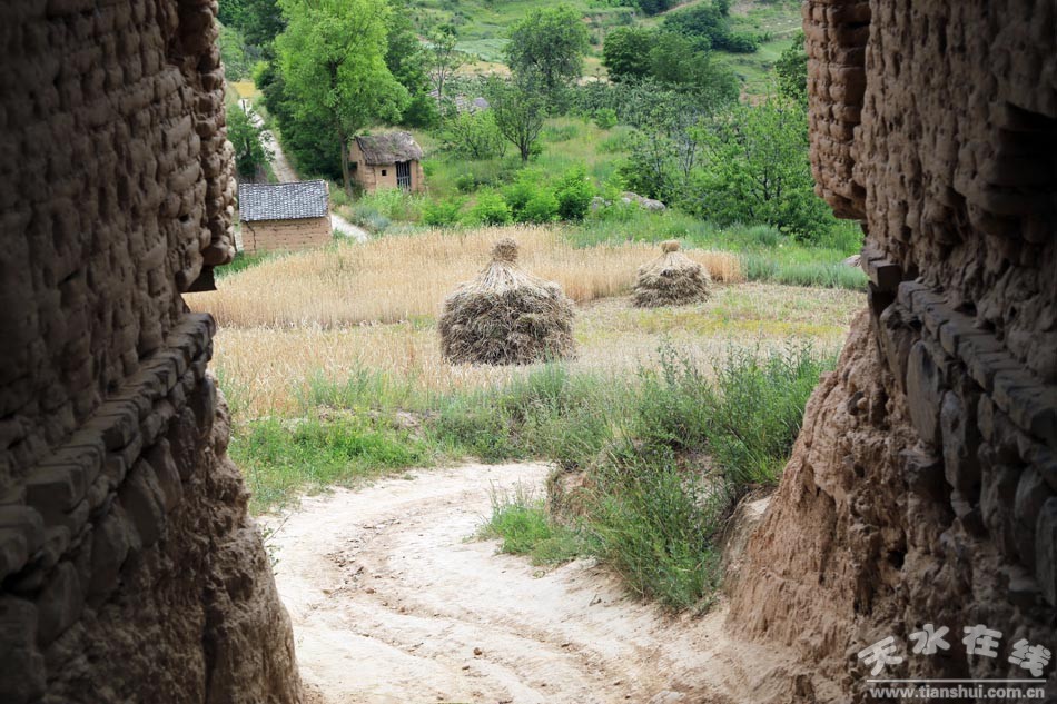登上点将台俯瞰整个古村,一座座错落破败的农舍,一片片杂草丛生的打麦场,像零散的积木,又像孤独的守望者,就这样依偎在夏花的臂弯里,那么小,那么僻静。远远望去,延绵的堡子山与西秦岭山脉相连,半山明亮,半山阴沉,山顶古树苍翠,草木繁茂;极目远眺,东面和西面两山上皆有一古堡,与曹操堡遥相呼应,静悄悄地低伏在光影之中。山脚下,南沟河、黑河沟从堡子山两侧流过,河水清澈翠绿,如两湾碧碧的玉带镶嵌其中,仿佛一对温柔可爱的姐妹,依偎在母亲的身边。它们静静地流淌,像一面历史的镜子,带我们穿越到古道征途。