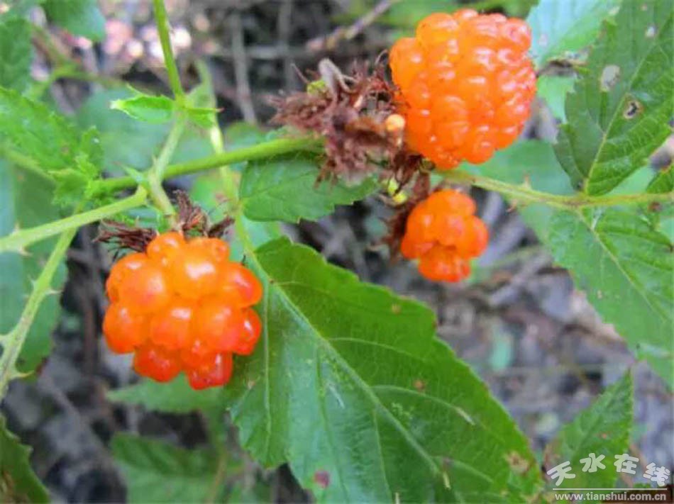 地莓子也叫坡莓子、黄莓子,苗形像苦苣菜,地莓子贴地成蔓,但全身长刺,尖刺特别锋利,叶片青绿稍细,最喜欢在山坡上生长,颜色为橘黄色,味道酸甜可口。有过农村成长经历的人大多采食过此果。地莓子对生长环境要求不高,但通常生长于山沟石砾滩地及土层较厚处,山林内、路旁边也常见。中伏时期,珍珠般的莓子就嵌满山坡,恰如盏盏灯笼,映得满坡一片橘黄。百度词条上说地莓子主要分布陕西、甘肃,青海、四川等地区。现代科学研究证明,莓子含有有机酸、糖类及少量维生素C。
