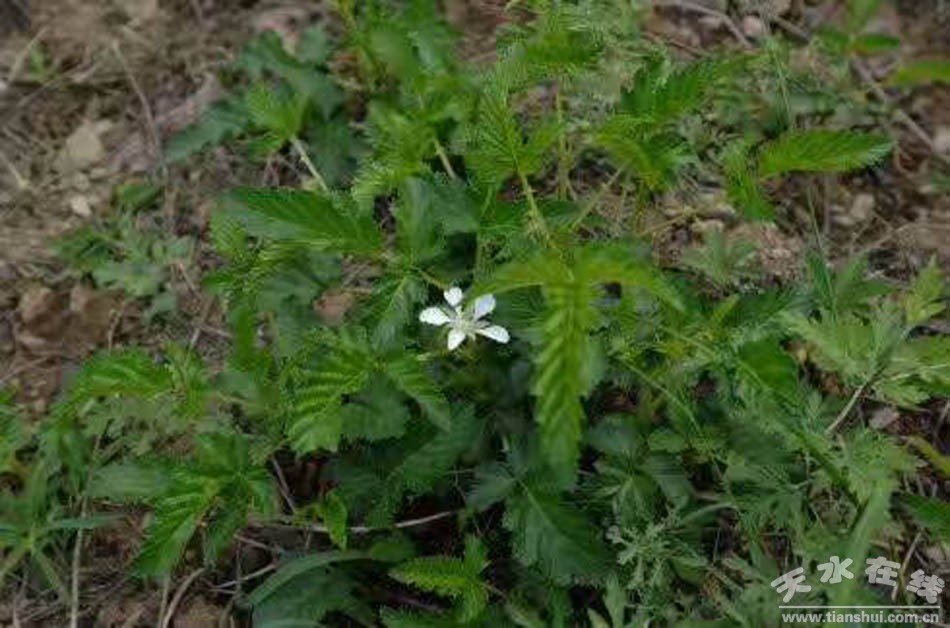 地莓子的根和叶均是药材,可谓全身是宝。莓子根,俗称莓子刺,药物学的学名地莓子、黄帽子、黄刺儿根。为蔷薇科悬钩子属植物山莓的根。地莓子为低矮半灌木状多年生草本,全体疏生基部膨大的皮刺。茎匍甸或向上,高10~30厘米。3出复叶,互生;小叶长圆形或椭圆状披针形,顶生小叶几比侧生小叶大1倍,长4~6厘米,近基部常有2浅裂,边缘具不整齐锯齿,两面无毛,下面脉上有刺;叶柄和叶轴散生皮刺;托叶披针形,有疏齿。花小,白色,单生或2~3朵形成伞房花序腋生或顶生;萼裂片卵形,先端尾尖,外面密被细刺,内面有毛;雄蕊和雌蕊均为多数。聚合果扁球形,橙黄色,可食用,味甜,微酸。生于山沟石砾滩地及土层较厚处。以根和叶入药。春、秋采挖,除去须根,洗净,切片晒干。自春至秋可采叶,洗净,切碎晒干。根有活血散疚、止血作用。功用主治为消炎止痛。主要治结膜炎,睑缘炎,无名肿毒。用法与用量,外用:煎水熏洗或捣敷。《中华本草》《陕西中草药志》均有记载。