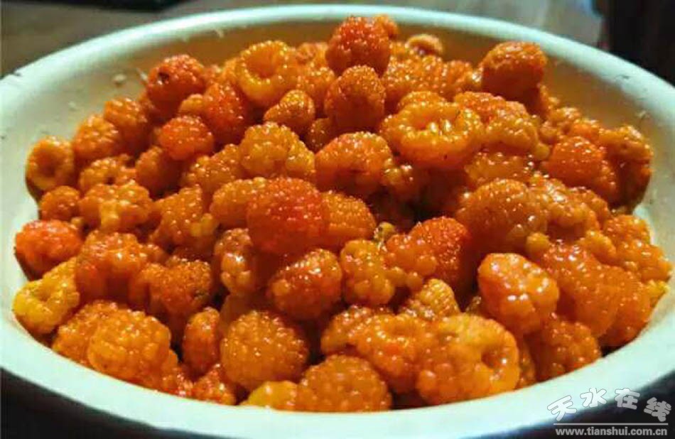 莓子是地莓子和蔓莓子的果实统称。天水莓子分为地莓子和蔓(wàn)莓子两种。尽管两种莓子苗的形状不同,但均是暮春四月开花,果子成熟于夏收之后立秋之前。两种莓子花色相同,开花结果过程也是相似,所生果子先是青黄,次后浅黄,尔后深黄,地莓子是橘黄色,而蔓莓子最后血红,成熟时色泽艳丽,鲜红欲滴,此时的莓果饱满硕大,果肉中空无皮无核,是上佳的美味。