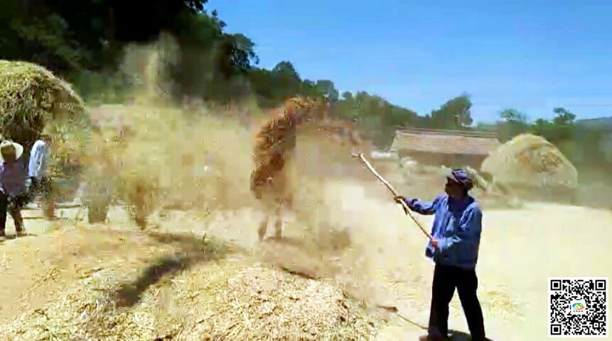 果然,水泥路不长,道路依然是瓷实光滑的乡间小路,小路尽头,崖下麦场里,男人在噼噼啪啪地打碾,然后用木锹将麦粒儿均匀扬向空中,麦子沉甸甸地落下来,麦皮飘向了另一边。女人麻利地穿梭过来,一簸箕铲起麦粒儿,咔嚓咔嚓再细细地簸一遍,大口袋,小口袋满满当当地装好,架上毛驴车便拉回家了。时下,各家种的粮食不多,毛驴车轻轻便便的,一串铃声叮叮当当,悠远韵长,落在尘烟里。