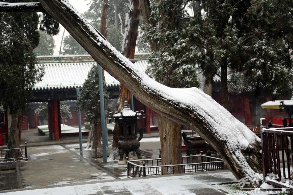 老树,是历史的哨兵。他一动不动,眼前风物却斗转星移,代有更替。两千多年,任谁也站累了。于是,古柏斜斜地躺了下来。颀长的身子,搭在一棵槐树上(又是槐树,守门做架的槐树)。过多的记忆,让他不堪重负,于是,他脱了衣衫,想吹吹山风凉快凉快,好奇的头脸,却又探出寺墙,继续兴致勃勃地观察着世事百态,烟火人间。或许心中的秘密太多了,需要一个“告密者”,把以前的事讲给今天和后来的人听,古柏倾斜的枯干中,生出一棵朴树。已两百多年,直径大约10厘米,黝黑的枝干直直地伸向天空,努力要突破旁边大树的遮蔽,树叶因风,述说着无穷的故事。树中生树,本不稀奇,树下常有小树生出,我们老家叫“抱”出来,大树抱子而出。但树种不同,全国唯此一例。
