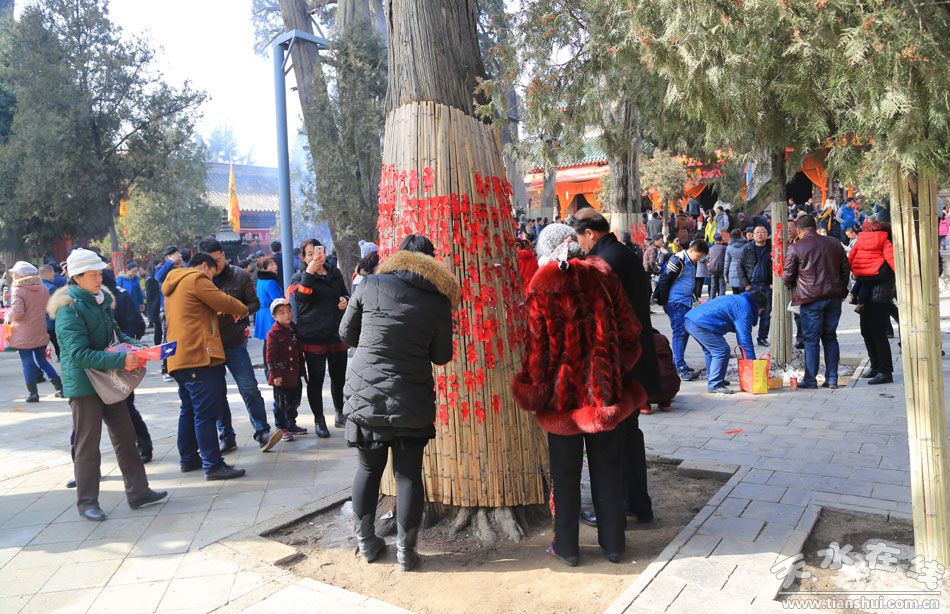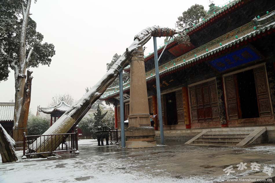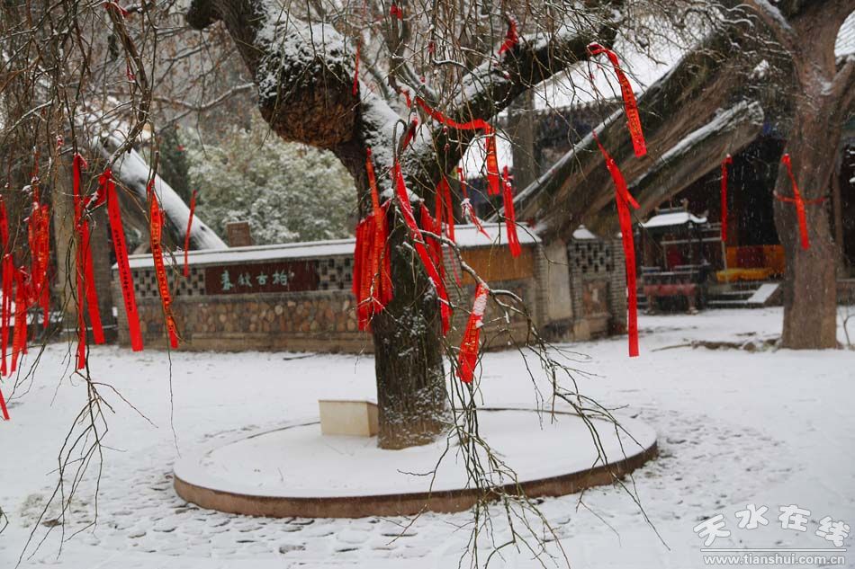 旁边,是一株龙爪槐。树龄虽只300年,和2500年的古柏,大门前1300年的国槐相比,年轻太多,在天水古树丛中,根本排不上号,却又与众不同,别有千秋。树冠枝干不是如通常向旁边伸出,而是扭曲向上,如一条条虬龙昂首问天。来到树下,讲解员会引导大家从特定角度观察,龙头龙身龙尾,当然不难看见,冬季叶落,更是一树龙蛇,栩栩如生。枝繁叶茂间,仿佛可见一鹿衔草若惊。“李杜文章在,光焰万丈长”,南郭寺供奉杜甫,则应有诗圣的偶像诗仙。“别君去兮何时还,且放白鹿青崖间,须时即骑访名山”,这衔草的鹿,当是李白放在秦岭之尾的青崖间的。树上红条密密麻麻,许愿人系上的。把心愿和祝福,说给伏羲的龙,李白的鹿,还有承着深深怀念的树。“传道东柯谷,深藏数十家。对门藤盖瓦,映竹水穿沙”,烟火天水,佳木依然。