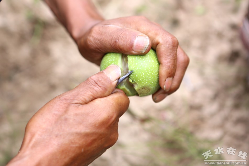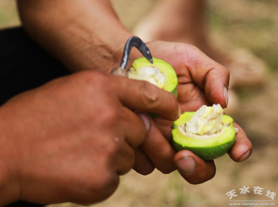 核桃要过了白露才能收获,但到八月份就可以吃了,而且,嫩核桃仁比成熟了的更可口。天水开发出“鲜核桃”的概念,就是吃这种将熟而未完全成熟的核桃。在我小时候,这种吃法主要是小孩子的专利,而且和“偷核桃”密不可分地联系在一起,要冒被骂甚至被打的风险。时代发展进步,不仅人有了“小鲜肉”,核桃也有了鲜的。虽不是“穿衣显瘦,脱衣有肉”,给核桃“脱衣”,却不是件容易事。