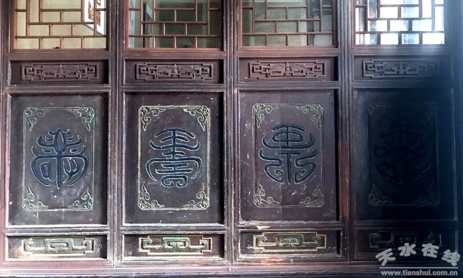 真正的大家族,正如鲁迅所说,并非金玉满堂,而是“笙歌扫院落,灯火下楼台”,富贵藏于文化,文化藏于生活。贾家公馆少见雕梁画栋、错彩镂金。岁月风尘,门窗梁柱屏渐渐暗红,似欲归于无声。仔细寻觅,却风雅处处。主轴线上庭院间由过厅连接,在天水古民居中绝无仅有,而过厅本身,即大有讲究。由敞亮的院落进入过厅,天光柔顺,仿佛轻抚历史刻痕。一幅幅木刻画,依然沉静生动地活在隔板上。伯牙抚琴高山流水、携琴访友共话音,最称贵者,是两旁各四幅异体“寿”字。中国人自求多福,寿则为福之最大者。“百寿图”所在多有,徽派建筑,有百寿藏于屋宇,寻之可得福寿的传统。海瑞为官至廉,事母至孝,母亲70寿辰时,亲书大“寿”字,分开来看,内含一句话“生母七十,人生百年春来寿”。海口海瑞故里有售,购者如云。贾家公馆的寿字,则另有特色,是“龟形蛇纹寿”,即笔画弯曲如蛇,字形椭圆如龟。曹操《短歌行》有句“神龟虽寿,尤有竟时。腾龙乘雾,终为土灰”,龟蛇乃长寿之物,化二类之形入字,可谓寿之又寿且再寿者也。66文创园近取诸物,把龟形蛇纹寿绘到瓷盘上,可复制、可带走,让今天的人,共享前辈心心念念的祝福与吉祥。贾家公馆有后花园,偶然发现,园中一草,叶极似龟形,叶脉蜿蜒如蛇状,不知数年前的主人,灵感是否来自园中花树呢?