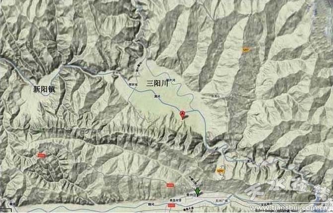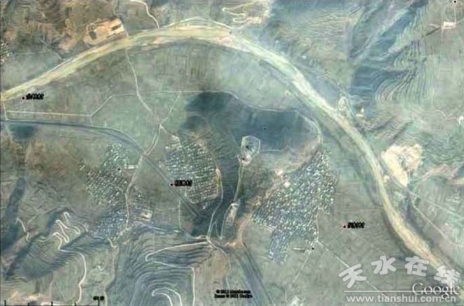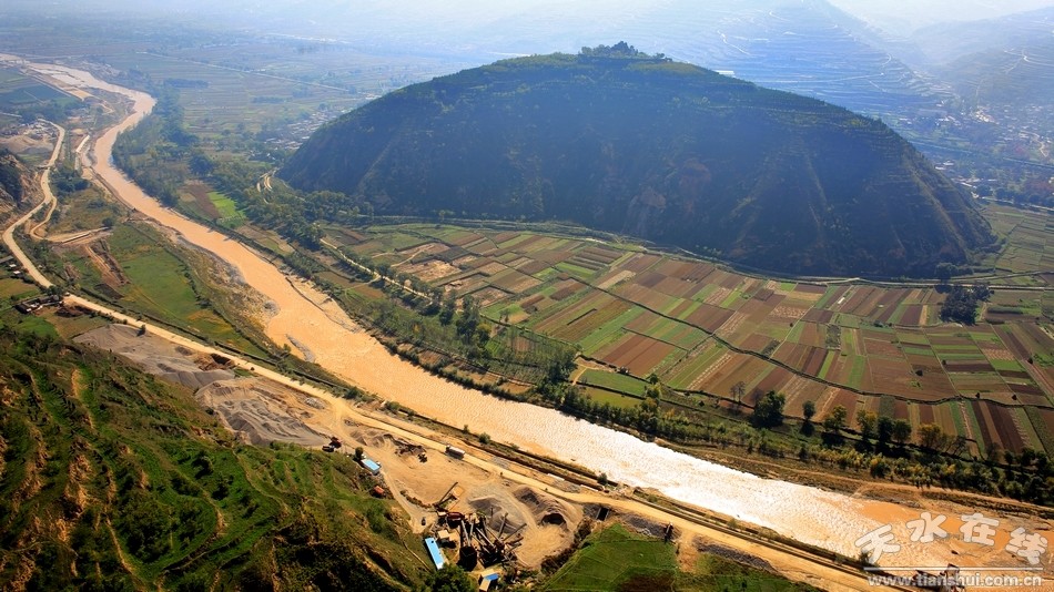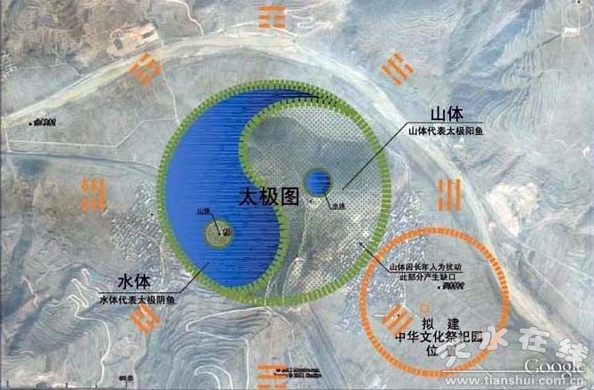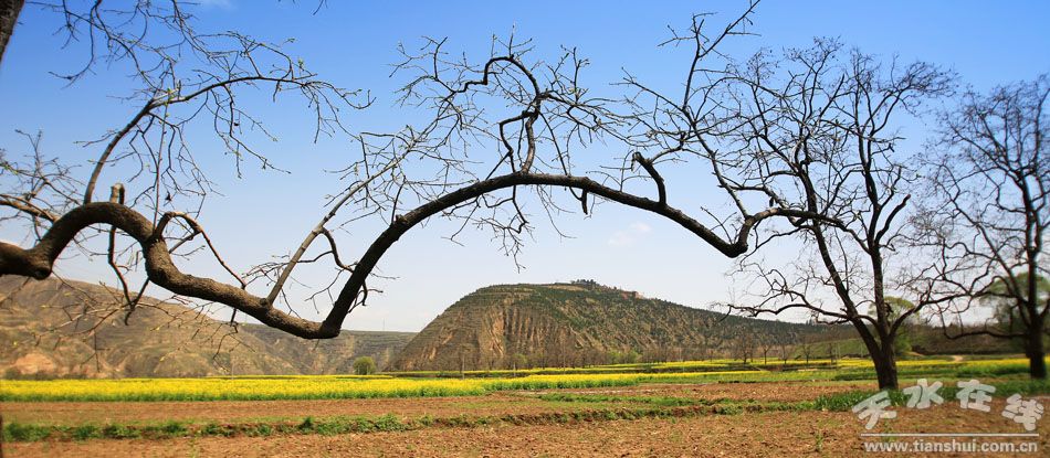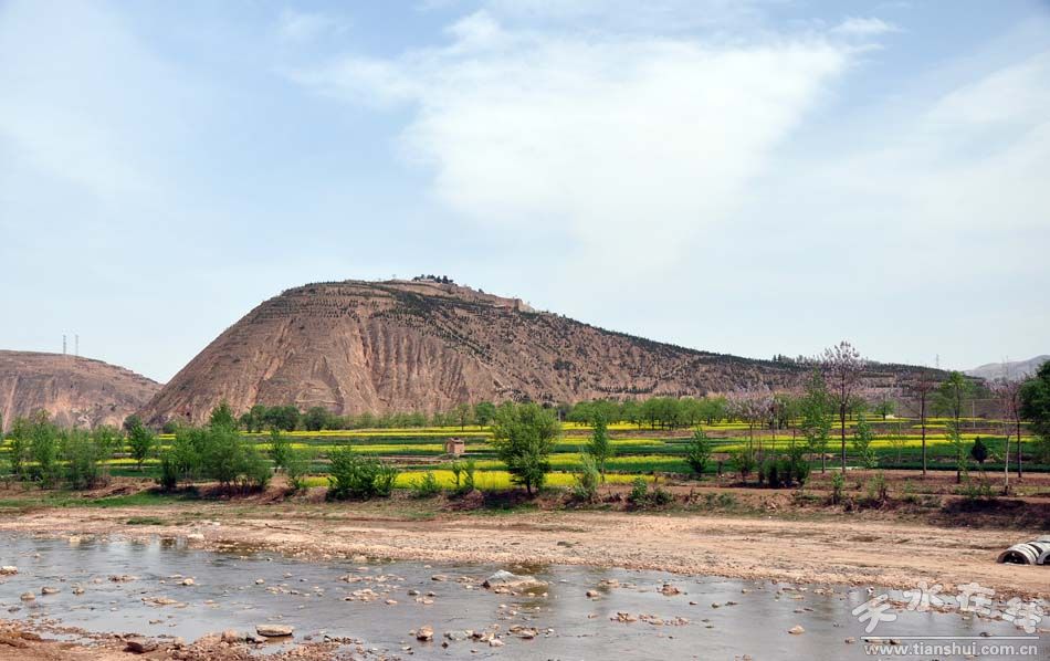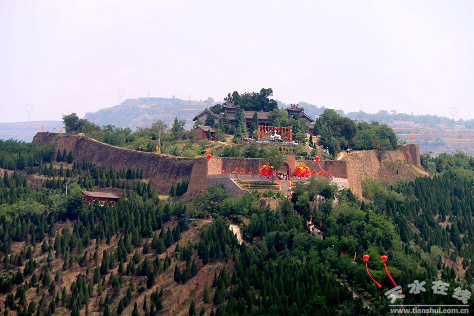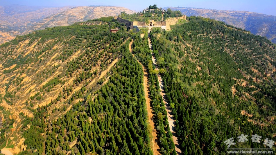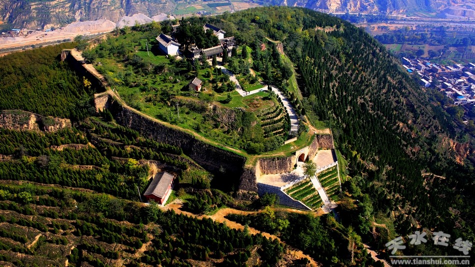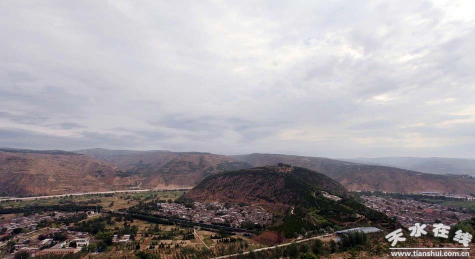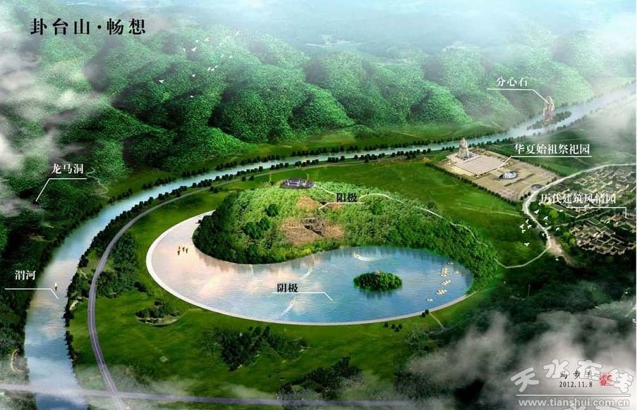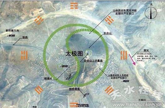 半山,有城门,正南,乾位。城围山而建,夯土筑就,有城垛八。乾为南,为天,为阳。卦象,三阳爻相叠。正南一望,正见三道山梁,自然造化的乾卦,出现目前。顺时针绕城一周,西南,巽,亦指风,连山环抱,西南有缺,渭水穿山而至,风行水上;正西,坎,水,渭河S形流过三阳川盆地,正西方恰是河弯水聚处;西北,艮,山,西北方,乃黄土高原,山峦无穷,树木茂盛;正北,坤,地,山峰相连,见峰见谷,时断时续,是为阴爻,三相叠,正乃坤卦之形;东北,震,雷,天水多冰雹灾害,“雨洒一大片,雹打一条线”,这条“线”,常在卦台山之东北方位,可见,先祖之发现,至今而然。正东,离,火,东为太阳升起之处,朝阳如火;东南,兑,泽,渭河流淌,聚于山脚,古代为一湖泊。“日月经天,江河行地”,太阳、月亮,都在正南方升至天顶,故南为天,相应,则北属地。和阴阳太极一样,八卦同样是个性与共性,特殊与一般,具体和抽象的统一。伏羲“仰观天文,俯察地理”,所观所察,乃卦台山之天,三阳川之地也。太极八卦图,可以说是中华文化无可争辩的第一Logo,而它的产地归属,无可争辩,在天水。