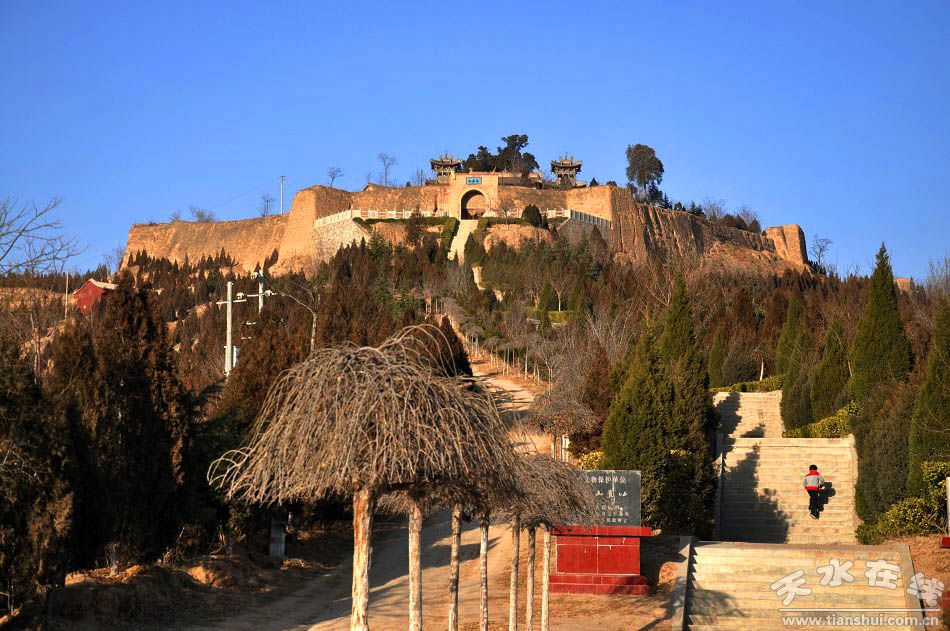 一座城门屹立半山,土坯垒就,如窑洞形。门头书“伏羲城”三字,颜体,庄重敦厚。城建于宋代,夯土筑成。曲阜造城护卫孔庙,天水筑城拱奉伏羲。孔子“晚而喜易,读易,韦编三绝”。孔子习学者,乃文王周易,源在伏羲。可惜孔子问礼于老子,只在洛阳,未能向西行,老子出函谷关,不知所终,应回归卦台山了吧。