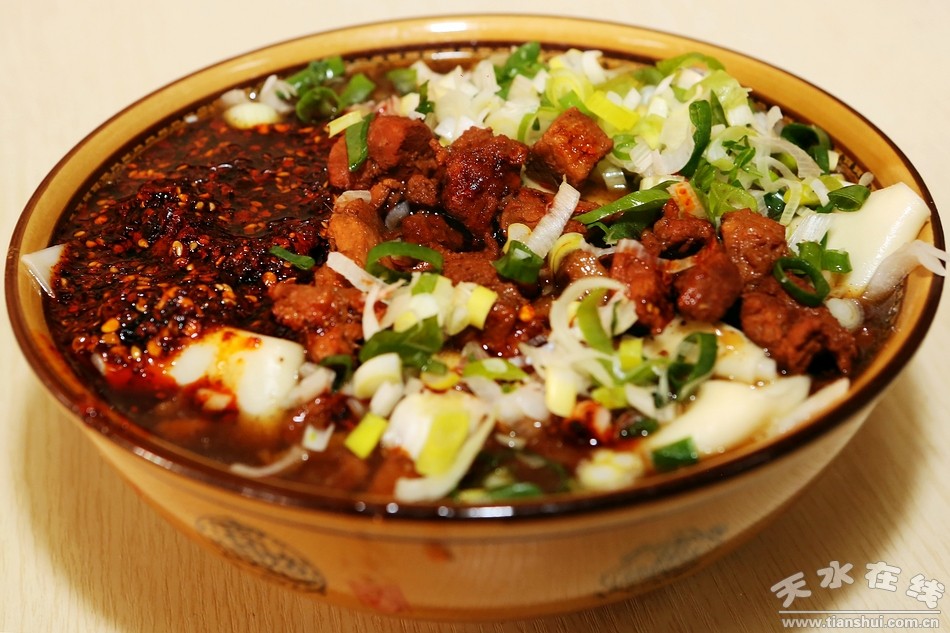 扁食有荤素之分,素扁食讲究的是霍头子(不知道三个字怎么写,只能谐音了)。白菜、胡萝卜切丝,加小波菜、绿豆芽,在开水里一滚,捞出备用。扁食捞到碗里,挑一筷子霍头子红红绿绿撒到上面,再撒一撮干辣椒面,滚烫的清油浇到上面,嘶啦一声,香味就散开了。当地人的灶台,一定有前锅和后锅。前锅大,后锅小,一前一后坐在灶洞里。前锅里的水烧开了,火从灶洞里穿过去,后锅也就滚烫,油就在后锅里一直热着。所以,每一碗扁食都会听到嘶啦一声。荤扁食要浇臊子,臊子也是在前锅里炒好后放后锅里热着。豆腐丁、洋芋丁、胡萝卜丁,海带,这些都是必有的,但不是臊子里的主角,主角是大肉臊子。