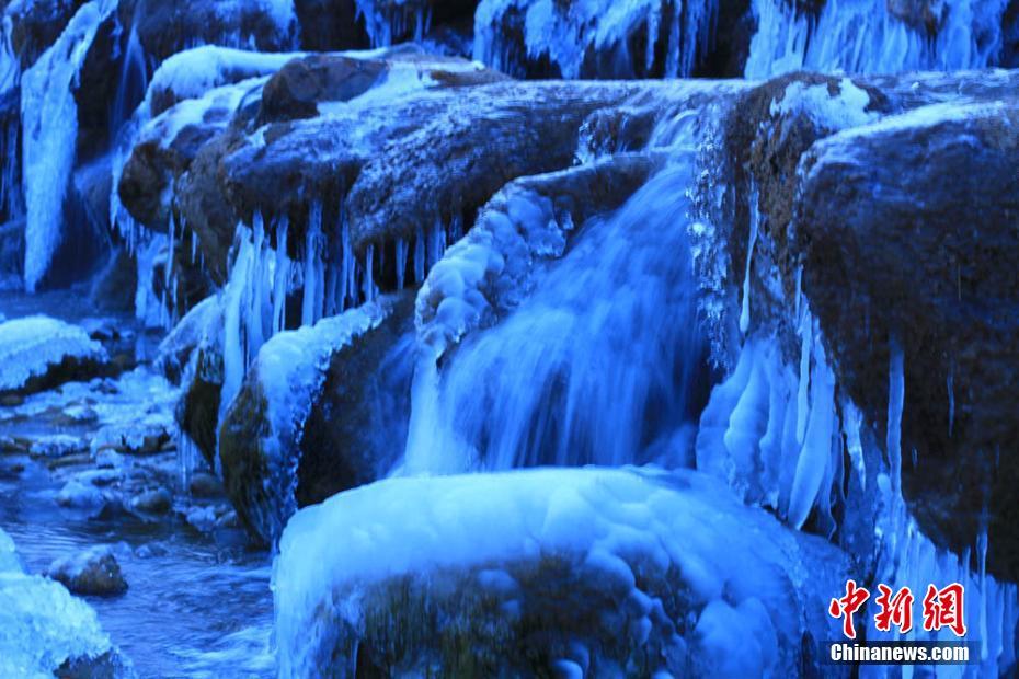 寒冬时节的清晨,地处甘肃河西走廊中部、祁连山下的张掖寒风凛冽,黑河湿地的瀑布形成各种形状的冰挂,由于气温比较低,太阳尚未出来,拍到的瀑布呈蓝色,更显冰清玉洁之美。陈礼 摄